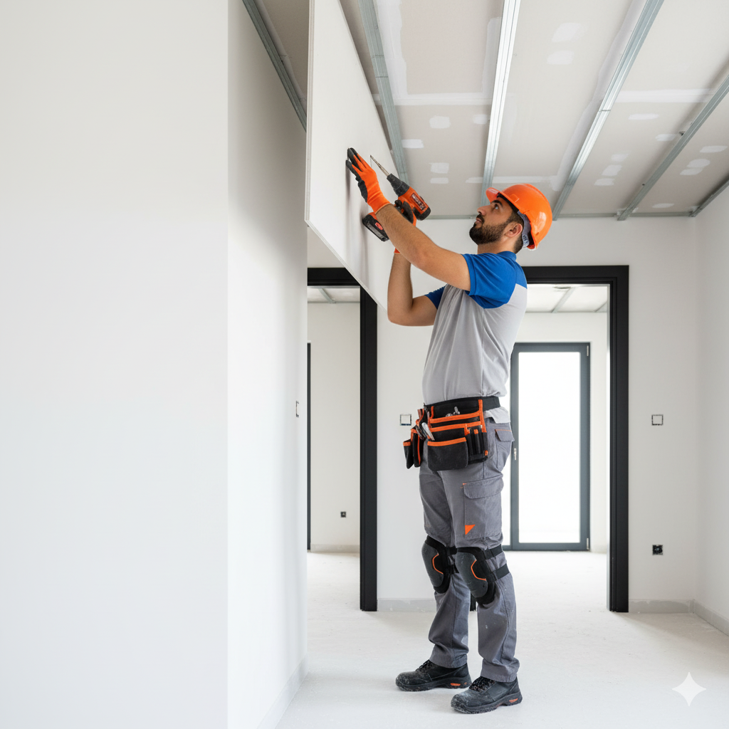 Seamless partitions and ceilings with straight joints. We frame, board, tape, and sand to a paint-ready finish—fast, tidy, and reliable.